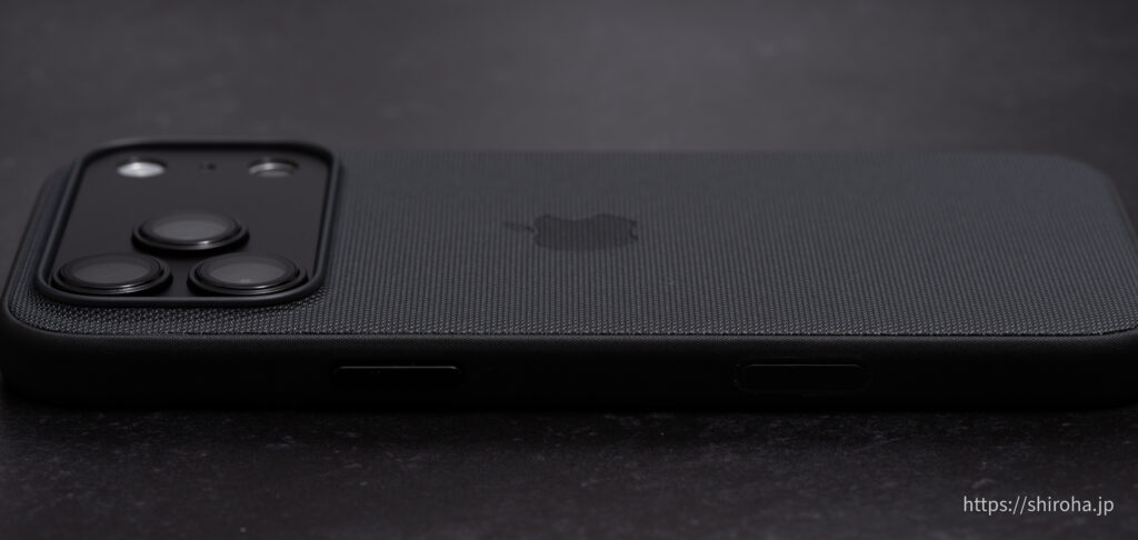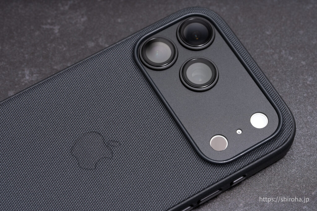 まずはデザイン性。完全なブラックではなくグレー味のある色ですが、カメラ保護カバーと組み合わせるとiPhone 17 Pro Max ブラック風にすることができます。
